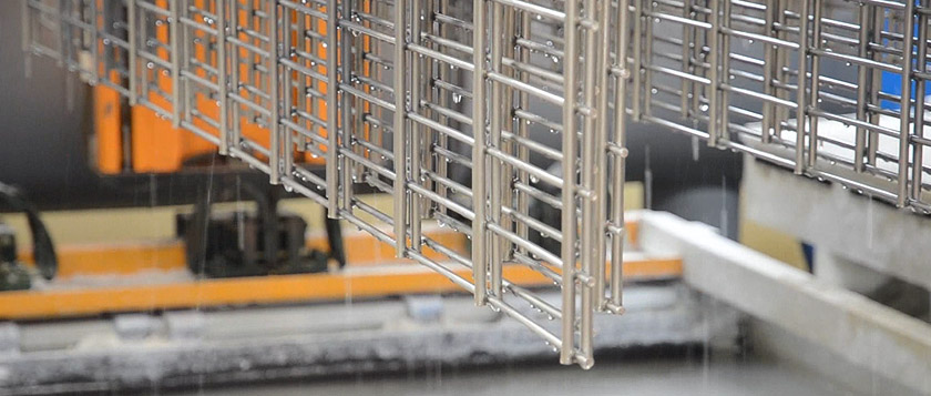 Galvanisation is carried out using an electrolysis process. The surface of the fence is degreased and immersed in an electrolytic bath, allowing the steel mould to be coated with a precise and smooth layer of zinc. A chromium passivation layer is also applied to the galvanised mesh panels to provide the zinc with additional protection against oxidation.